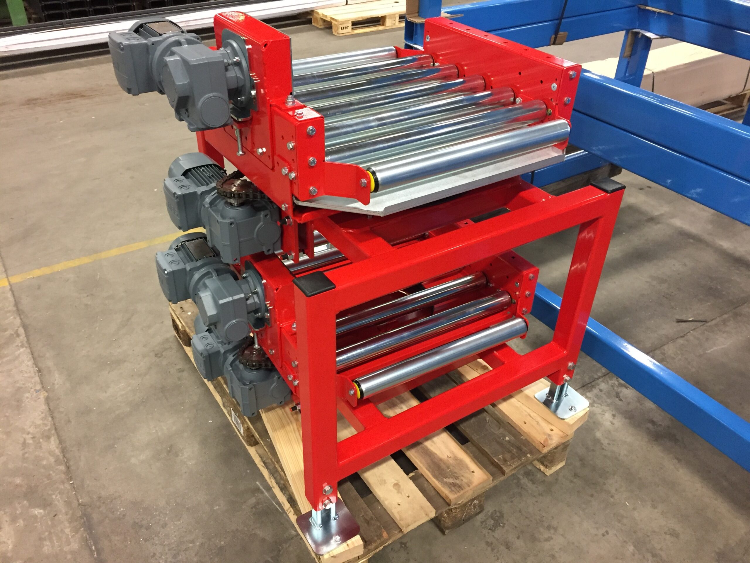 KE500: Vrid-& svängmoduler (1) Rullbana, fast driven för vridmodul typ VR (2) Vridmodul typ VM (3) Klämskyddsring till VM (4) Svängmodul typ SM Vridmoduler med 2 st vridbara rullbanor ovanför varandra. Vridmodul med Pneumatiskt stopp.